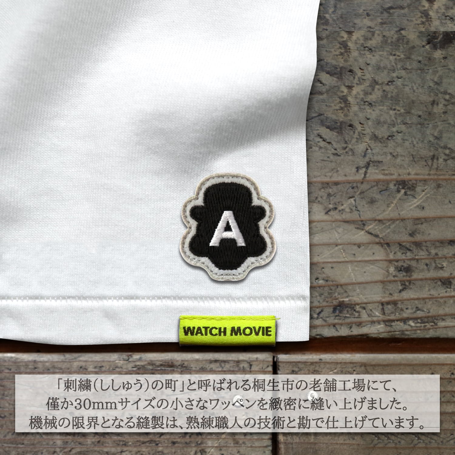 【高精密ワッペン解説】国産の刺繍(ししゅう)技術の限界に挑戦!Tシャツ袖部分には、HIS NAME IS ”A” 特製ワッペンが付きます。「刺繍の町」と呼ばれる群馬県桐生市の老舗工場にて、国内最高クラスの刺繍技術を駆使して僅か30㎜の小さなワッペンを緻密に縫い上げました。