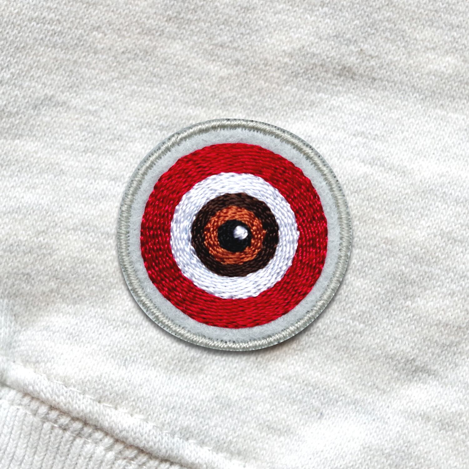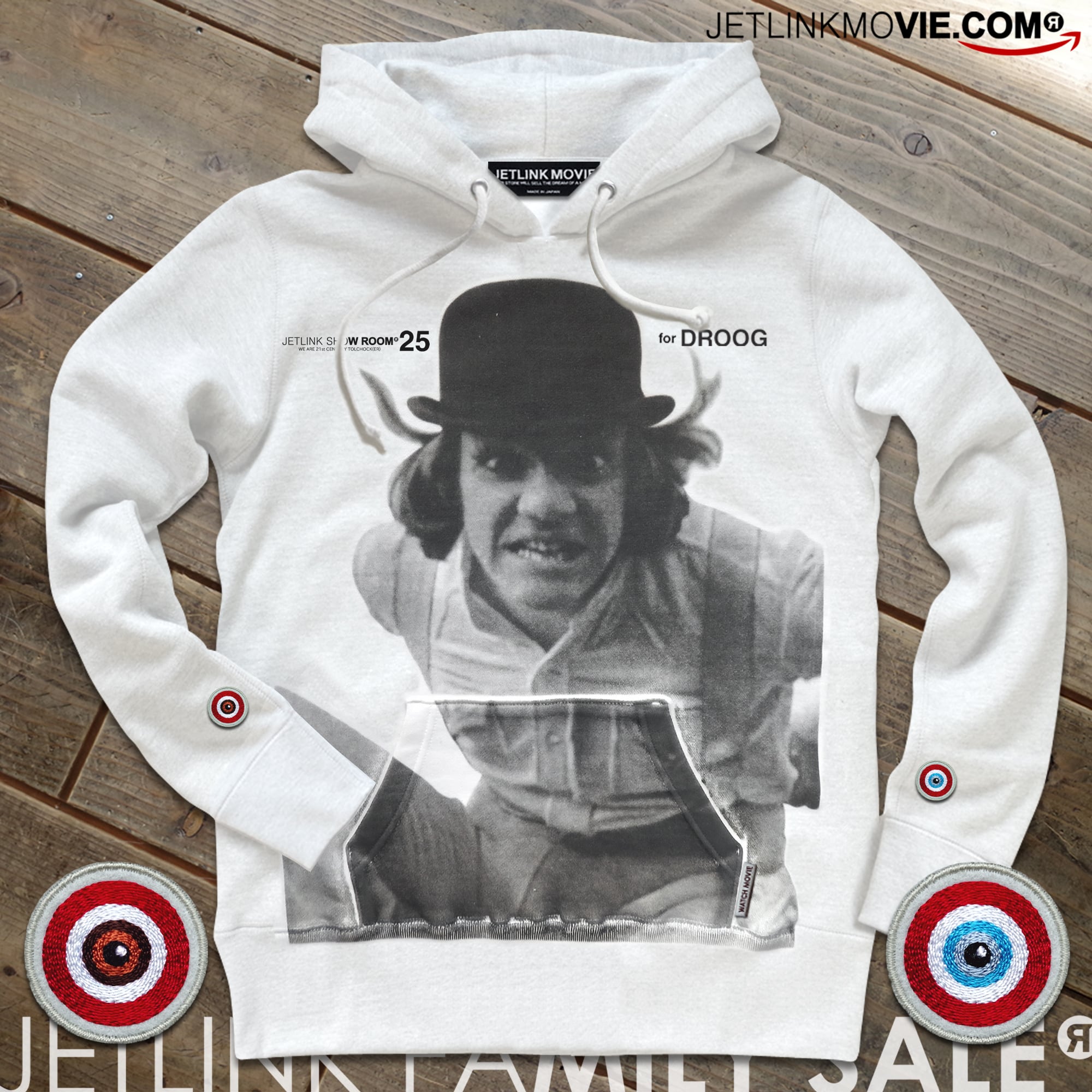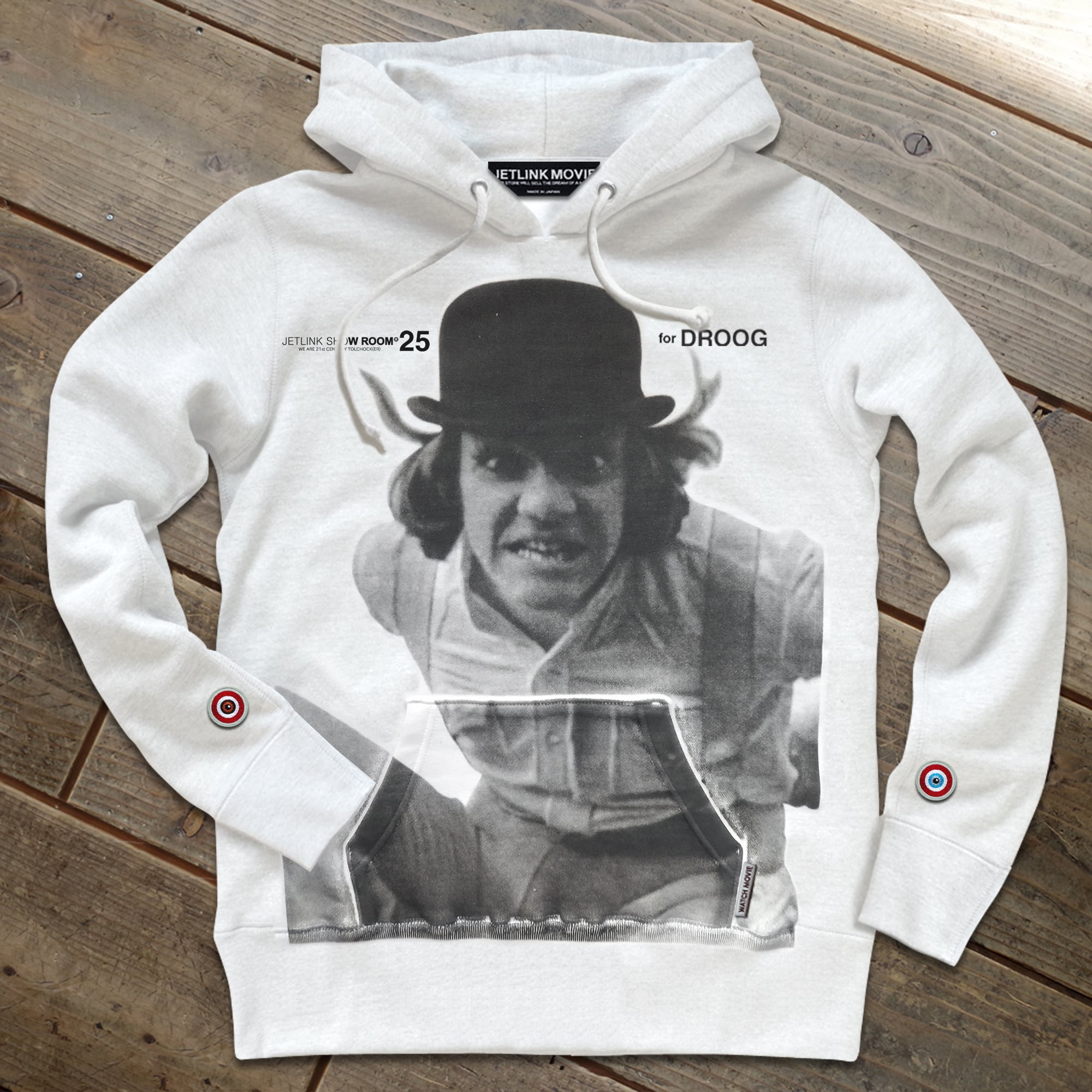 【高精密ワッペン解説】スウェットパーカー両袖に輝く目玉型の特製ワッペンは、ミシンを回転させて刺繍することで眼球の奥行きや質感をリアルに再現しています。「刺繍(ししゅう)の町」と呼ばれる群馬県桐生市の老舗工場にて、国内最高クラスの刺繍技術を駆使して僅か30㎜の小さなワッペンを緻密に縫い上げました。「人間の本質とは暴力である」...瞳の色の差異=人種間の超越を意味する目玉のモチーフには製作者が生涯の作品を通して一貫した主義思想が反映されています。