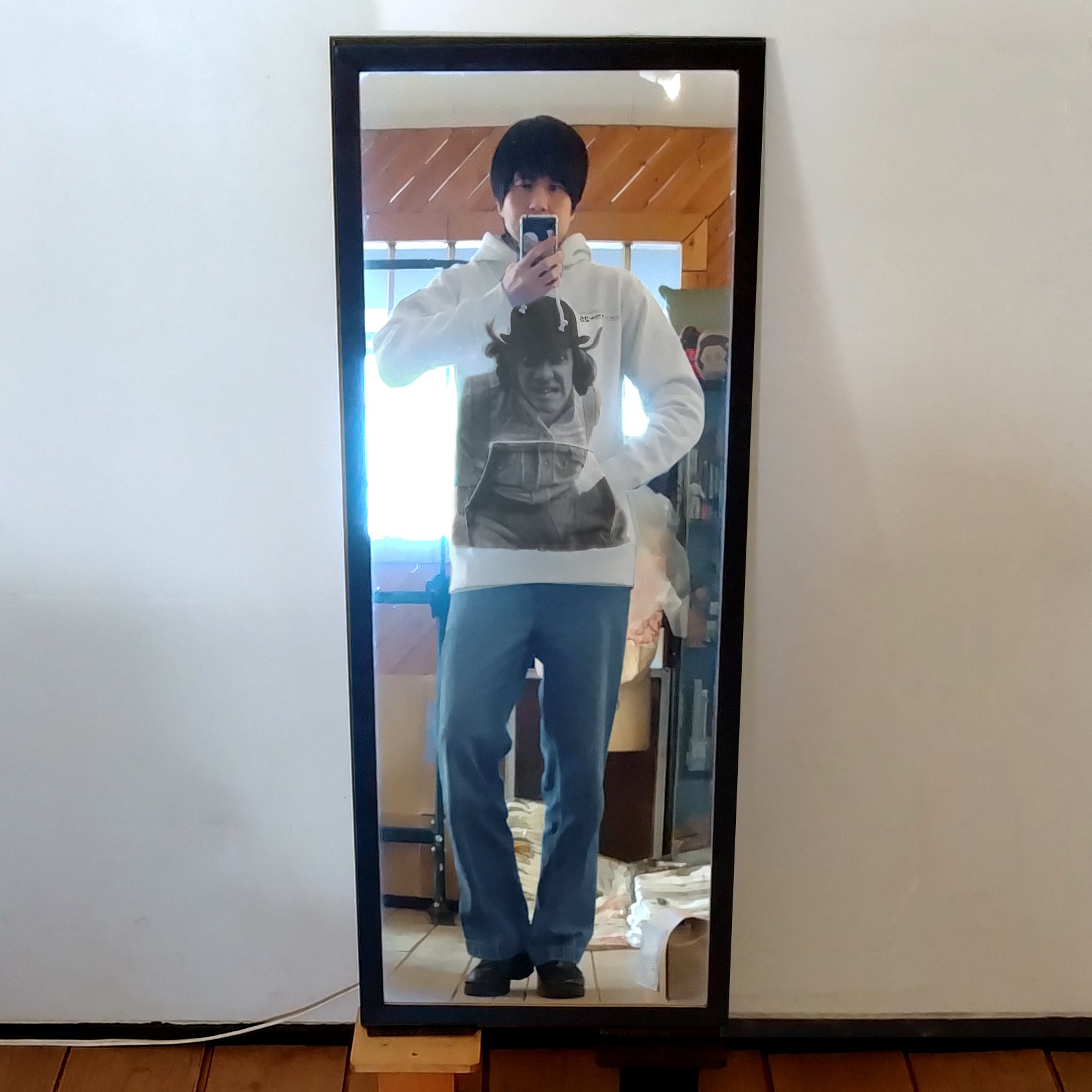 【モデル着用例①】スウェット着用モデルはJETLINKデザイナー渡辺純。身長177cm、体重62kgで3サイズ(L)を着用しています。ややゆったりと着たい時には4サイズ(XL)を着用しています。ヴィンテージ感が強めのバニラホワイト生地は、古着のように汚れを気にせずボロボロになるまで着倒したい一枚です。