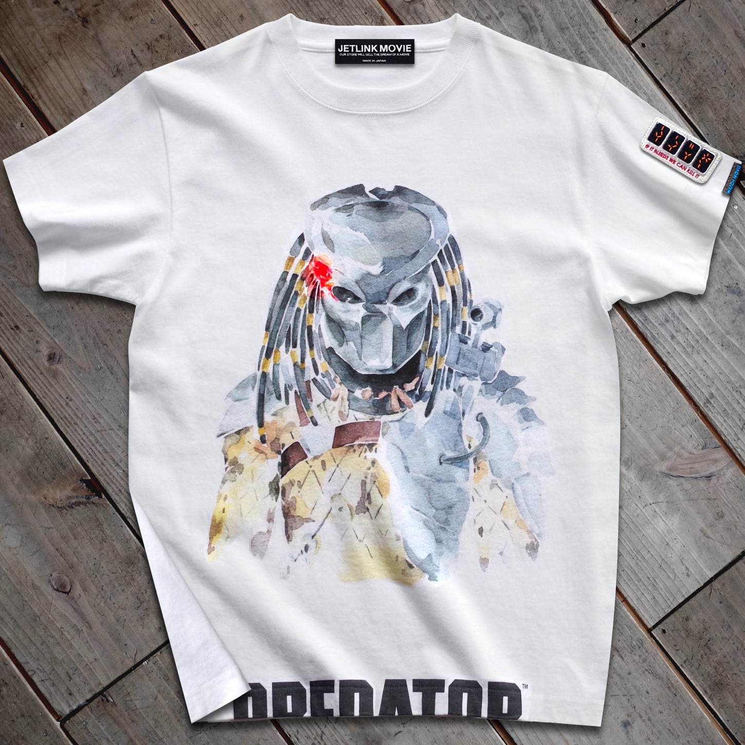 【高精密ワッペン解説】「IF IT BLEEDS WE CAN KILL IT」(やつが血を流すなら殺すことが出来る)...アラン・ダッチ・シェイファー少佐を演じたシュワちゃんの有名なセリフです。Tシャツ左袖(そで)部分には、映画『プレデター』一作目の劇中でプレデターが左腕に装着していた「コンピューターガントレット」(自爆装置)をデザインした特製”PREDATOR GAUNTLET”ワッペンが付きます。刺繍(ししゅう)の町と呼ばれる群馬県桐生市の老舗工場にて、国内最高クラスの刺繍技術を駆使して小さなワッペンを緻密に縫い上げました。刺繍糸からワッペンの土台となるフェルト生地に至るまで全てJETLINK特注品を使用しています。小さいパーツながらも日本の職人技術が誇るメイド・イン・ジャパンの逸品をお楽しみください。