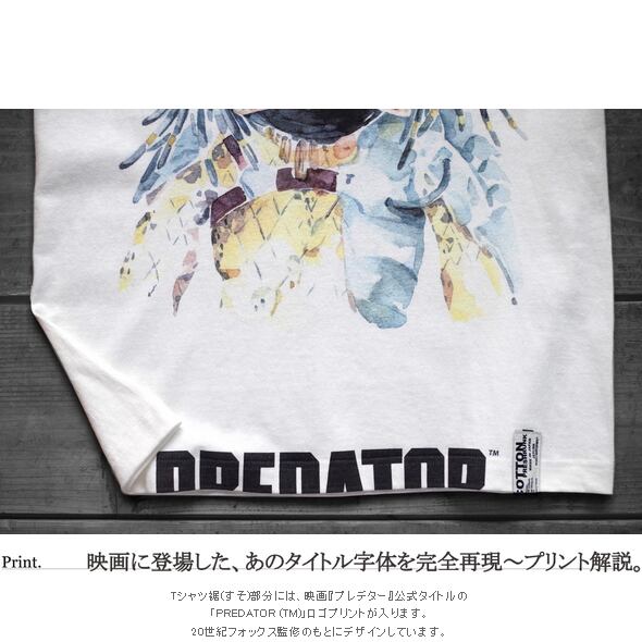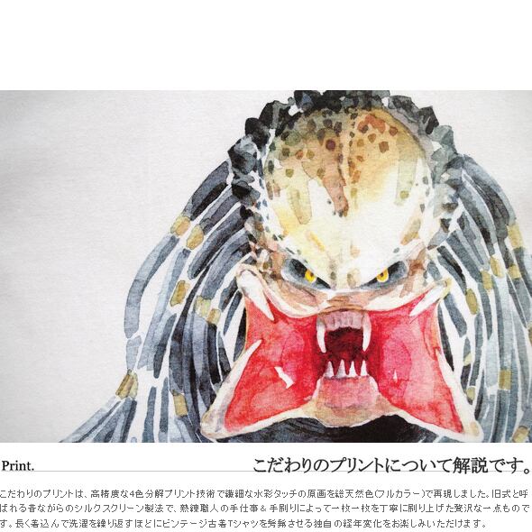 【商品解説】1987年に公開されたジョン・マクティアナン監督&アーノルド・シュワルツェネッガー主演の名作SFアクション映画『プレデター』PREDATOR×JETLINKが繋がります。 映画一作目に登場した地球外生命体プレデターをJELINK独自のフィルターを通して、繊細な水彩タッチの原画を総天然色(フルカラー)でデザイン&再現しました。 SF映画に造詣が深いデザイナーのこだわりとセンスを反映させて、大人が着れる映画Tシャツを~既存の映画『プレデター』を題材にしたTシャツには無かったJETLINKならではの洗練されたデザインに仕上げています。 かつては映画好きの少年だった僕たち世代へ...現時点で可能な限りの贅沢を極めた大人の逸品をお楽しみください。