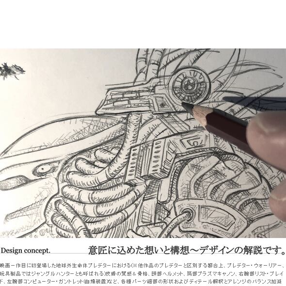 【デザインの解説~意匠に込めた想いと構想】映画一作目に初登場した地球外生命体プレデターにおける(※他作品のプレデターと区別する都合上、プレデター・ウォーリアー、玩具製品ではジャングルハンターとも呼ばれる)皮膚の質感&骨格、頭部ヘルメット、肩部プラズマキャノン、右腕部リスト・ブレイド、左腕部コンピューター・ガントレット(自爆装置)など、各種パーツ細部の形状およびディテール解釈とアレンジのバランス加減に気を配りながらイラスト全体の構図を決める作業を進めました。「静)のエイリアンに対して「動」のプレデターが跳躍して戦闘体制に入る際の姿勢および、頭髪や装備品の踊るような躍動感は、日本画の「風神雷神図」を参考にして描きました。また作品の舞台となったジャングル内における光源の位置や当り方に至るまで計算に入れて、作り手として、いちプレデターファンとして納得がいくまで徹底的に描き込んだ高精密画として仕上げています。