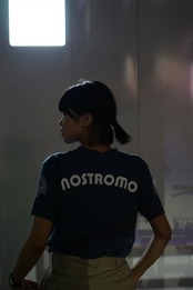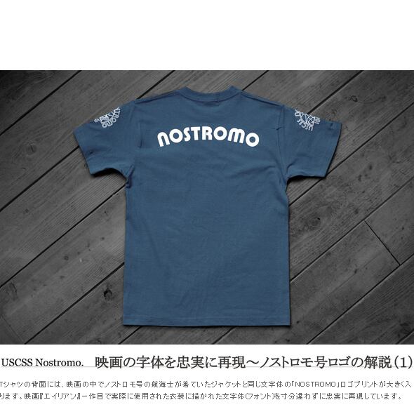 【映画の文字体を忠実に再現_01】Tシャツの背面には、映画の中でノストロモ号の航海士が着ていたジャケットと同じ文字体の「NOSTROMO」ロゴプリントが大きく入ります。映画『エイリアン』一作目で実際に使用された衣装に描かれた文字体(フォント)を寸分違わずに忠実に再現しています。