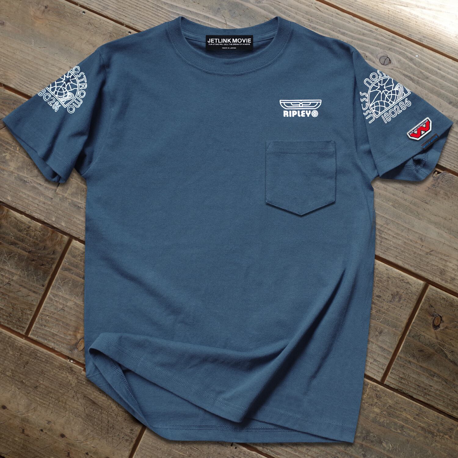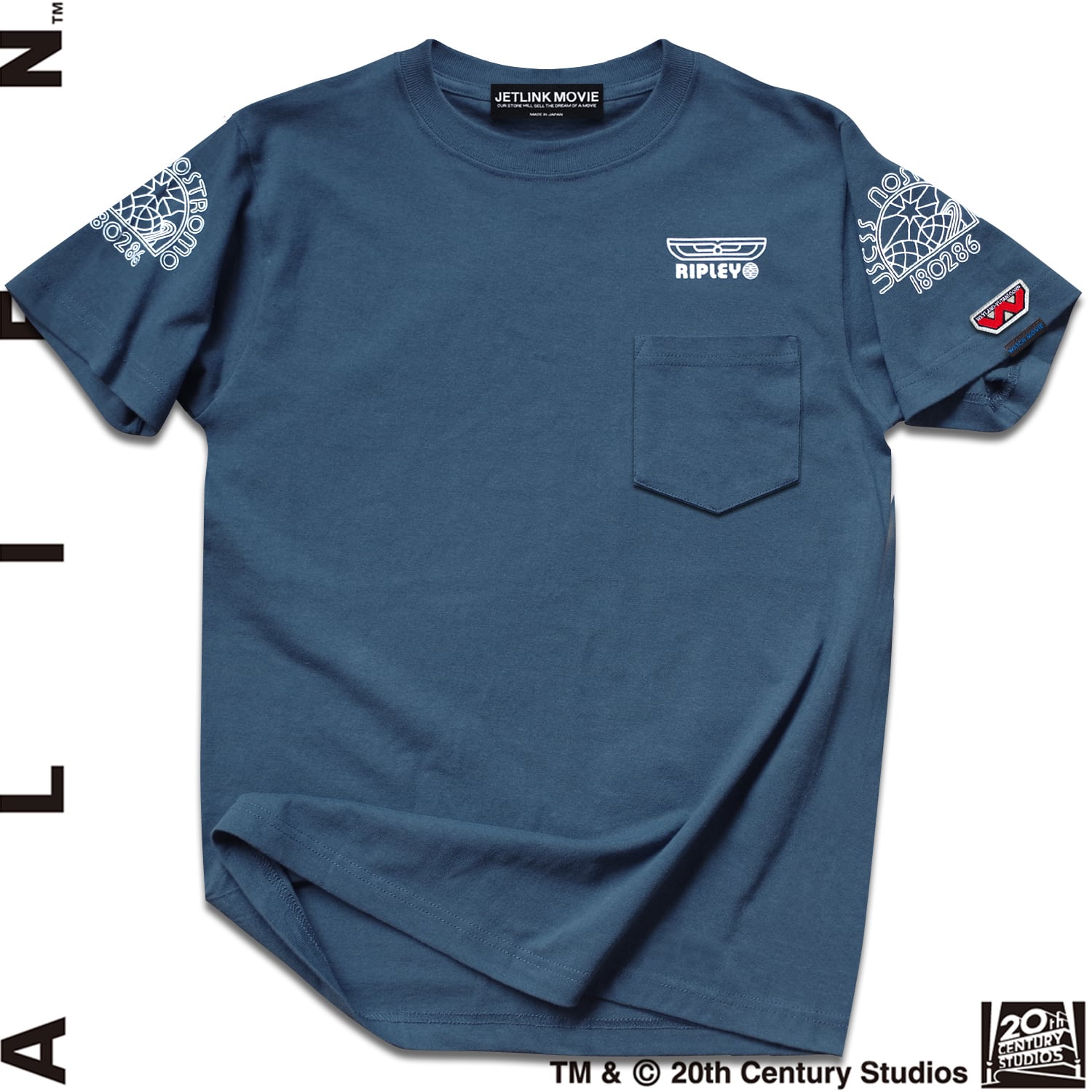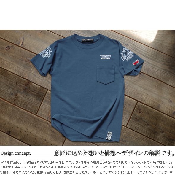【映画の文字体を忠実に再現_02】Tシャツの胸ポケット上部には、女優シガニー・ウィーバー演じる主人公エレン・リプリー准士官の階級章プリントが入ります。左右の肩部分にはノストロモ号のロゴワッペンをJETLINKのフィルターを通して現代風にアレンジしたロゴプリントが入ります。階級章ロゴを復原する際には、20世紀フォックスの公式資料だけではなく、映画『エイリアン』で実際に使用された現存する衣装および階級章を徹底的に研究&分析して、刺繍(ししゅう)文字体の歪み部分までも忠実に再現しています。
