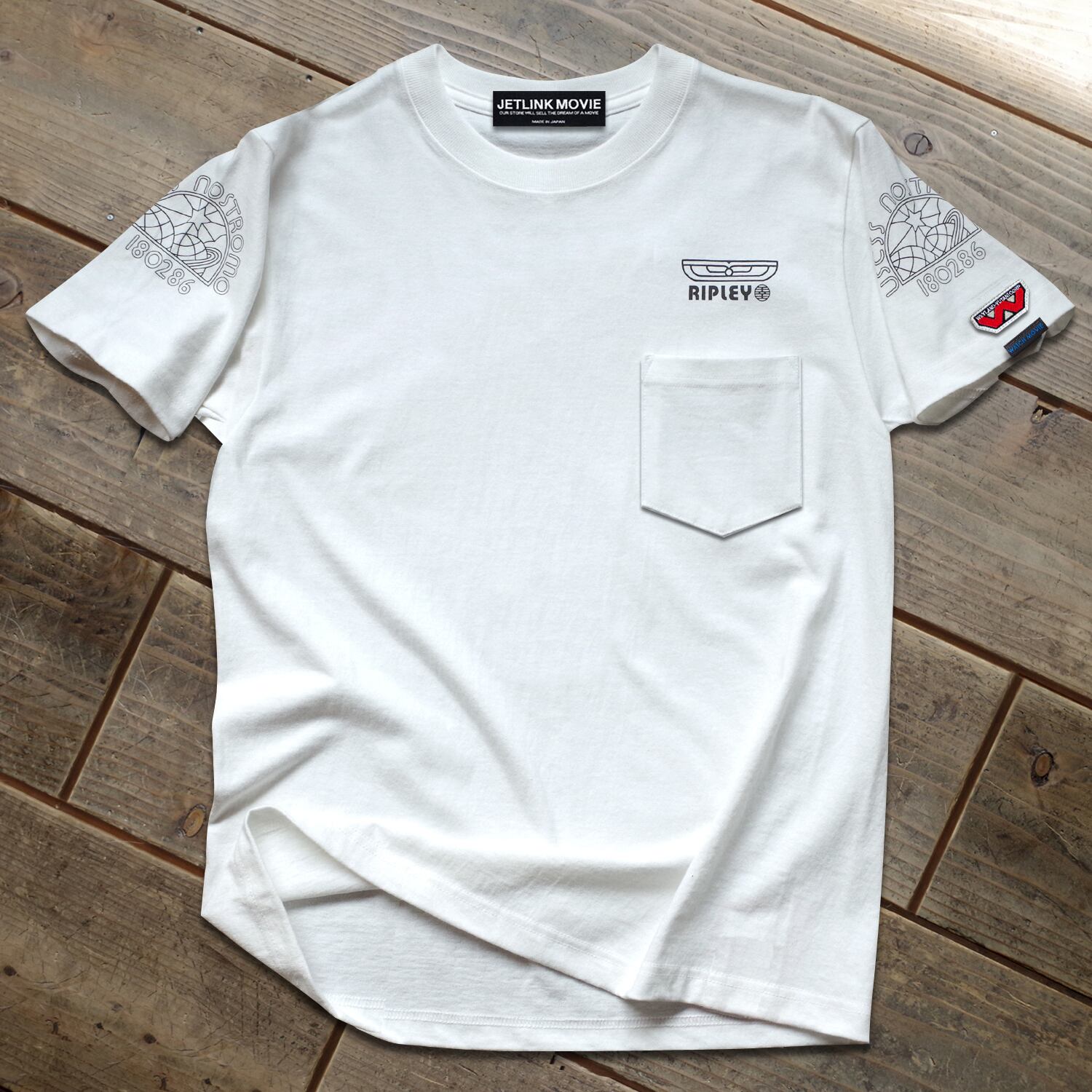 【映画の文字体を忠実に再現_02】Tシャツの胸ポケット上部には、女優シガニー・ウィーバー演じる主人公エレン・リプリー准士官の階級章プリントが入ります。左右の肩部分にはノストロモ号のロゴワッペンをJETLINKのフィルターを通して現代風にアレンジしたロゴプリントが入ります。階級章ロゴを復原する際には、20世紀フォックスの公式資料だけではなく、映画『エイリアン』で実際に使用された現存する衣装および階級章を徹底的に研究&分析して、刺繍(ししゅう)文字体の歪み部分までも忠実に再現しています。