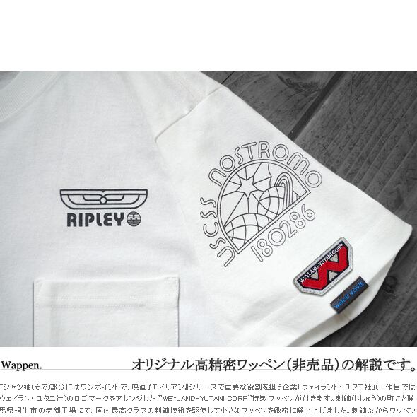 Tシャツ各部に入るロゴプリントの意匠は、映画で実際に使用されたノストロモ号航海士の制服および、階級章を研究&分析して、刺繍(ししゅう)文字の歪み部分までも忠実に再現しました。そで部分には、劇中に登場する企業「ウェイランド・ユタニ社」のロゴワッペンが付きます。